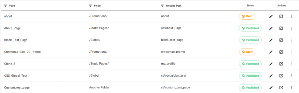 - Preview: Opens a preview in a new tab. If the page is unpublished, the preview will show B-Test parameters. For drafts, without these parameters, the page will return a 404.