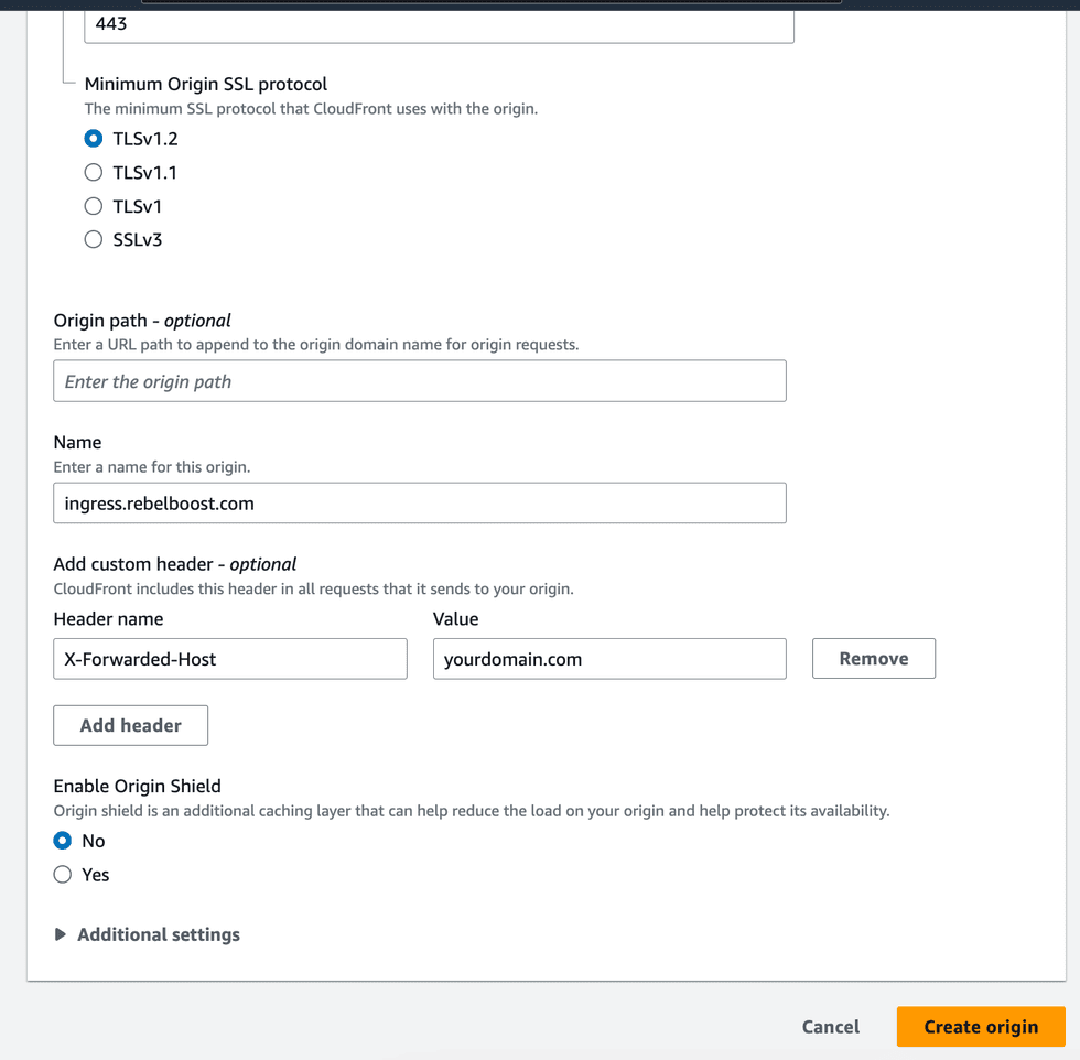 Go to your Cloudfront distribution in AWS console. Open Origins tab and click Create origin