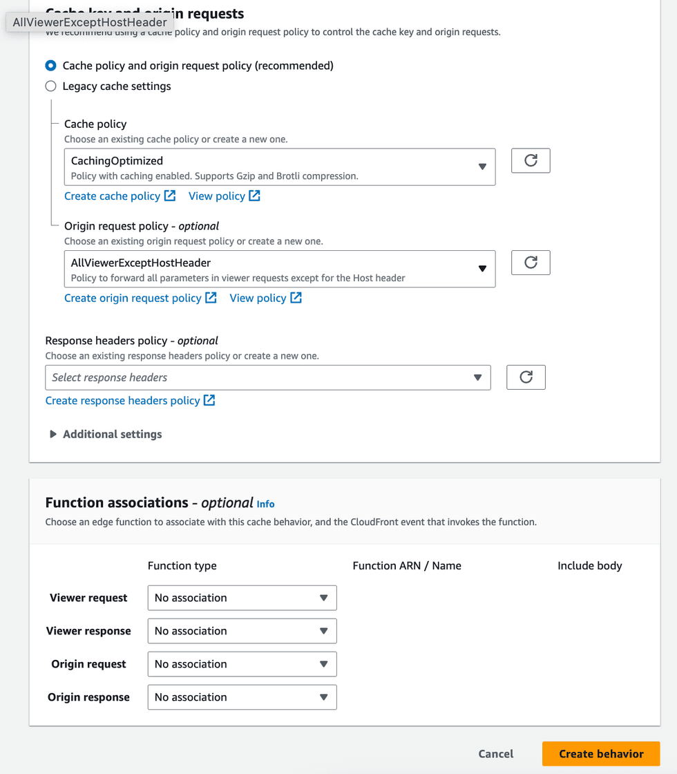 Change Cache policy to CachingOptimized and Origin request policy to AllViewerExceptHostHeader