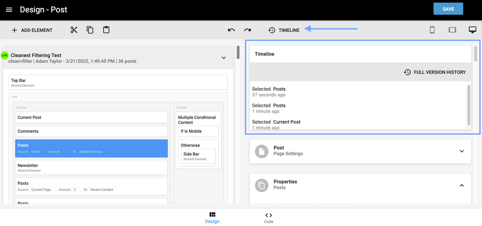 When you make any changes in Layout & Design Tool, the system automatically logs those changes, which you can see in real time from the interface. Simply click on the Timeline button in the top navigation to open the window: