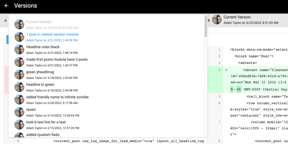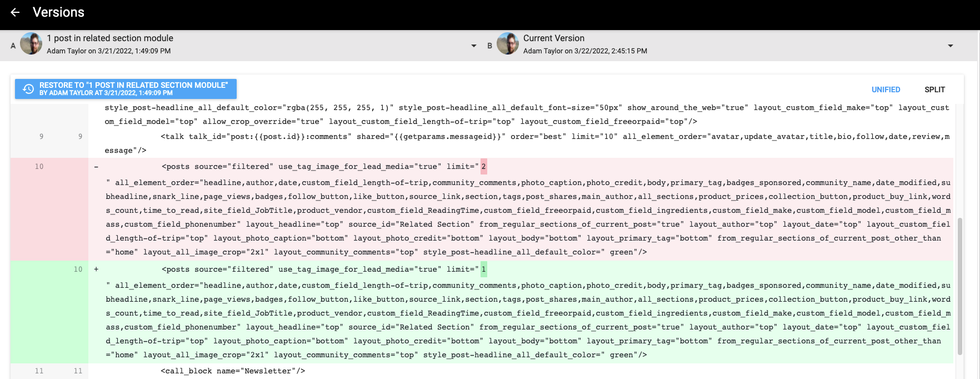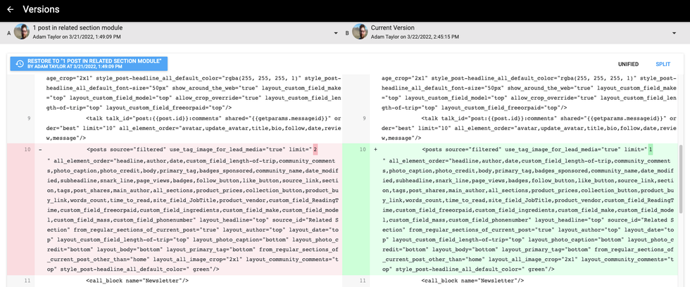 The first view that you see when you enter the full version history, is a side-by-side comparison of the live version of the page you’re editing (in code view) vs. the previously saved version. In the example above, you can see that my previous version has the detail “1 post in related section module.” That indicates that the last change that was made to this page was changing the number of posts in the module. When you save a change in Layout & Design Tool, you are required to input a brief description of the change, just for this purpose.