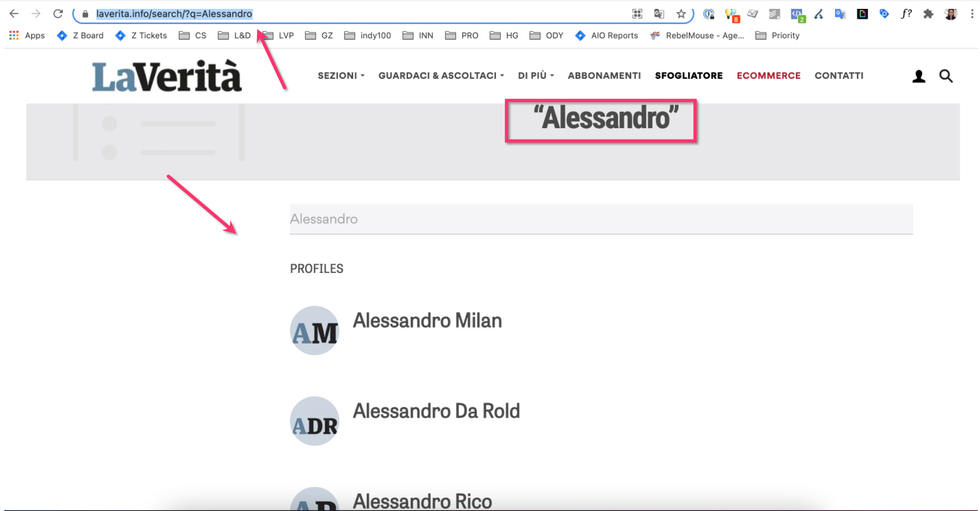 If you have multiple authors contributing to your content, you can customize your search results page by author profile. Here's an example from RebelMouse-powered La Verità.