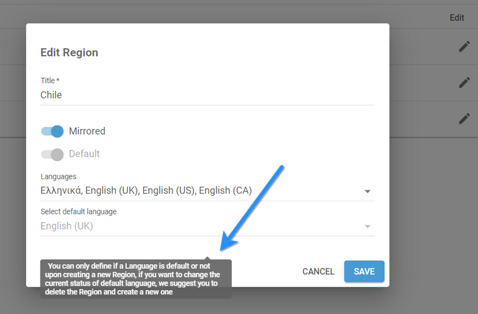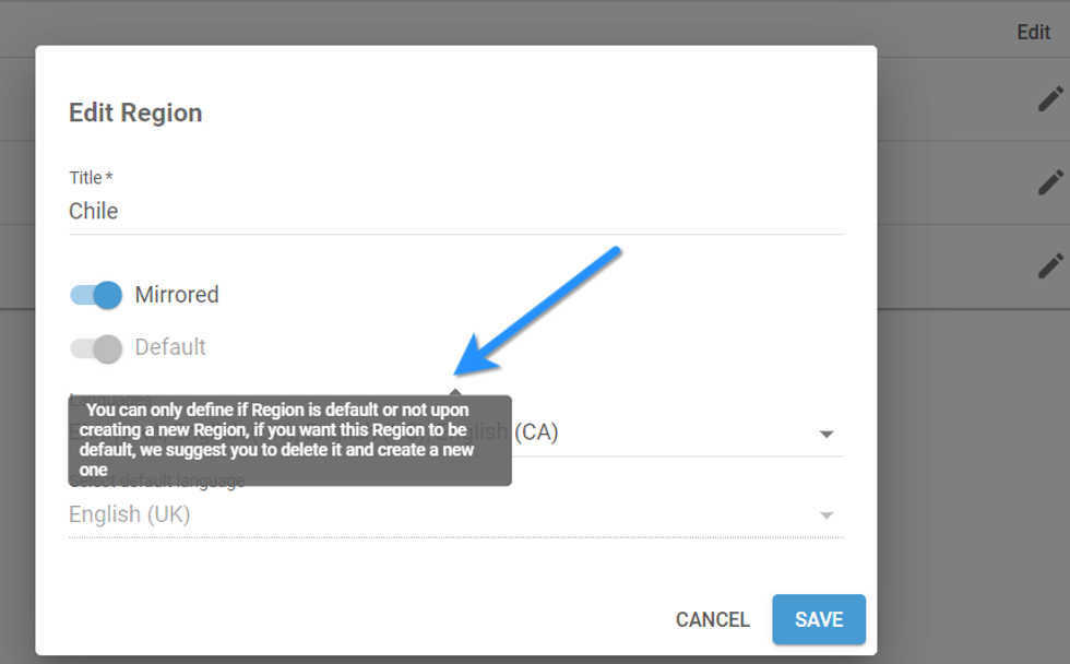 When creating a new region, you can set the region's name, languages, and default language. You will also see two toggles you can turn on and off: Mirrored and Default. If a post is created in a region that is mirrored, it will automatically generate a copy of that post in the other languages assigned to that region. If it's set to default, it will not replicate the post in any other languages.