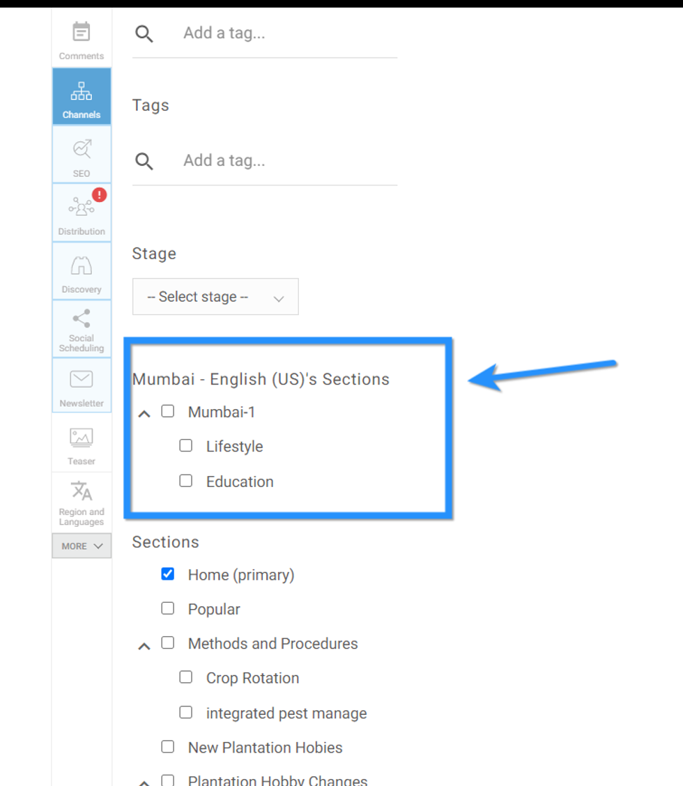 In Entry Editor, you can assign articles to community sections from the Channels tab located in the right-hand navigation sidebar.