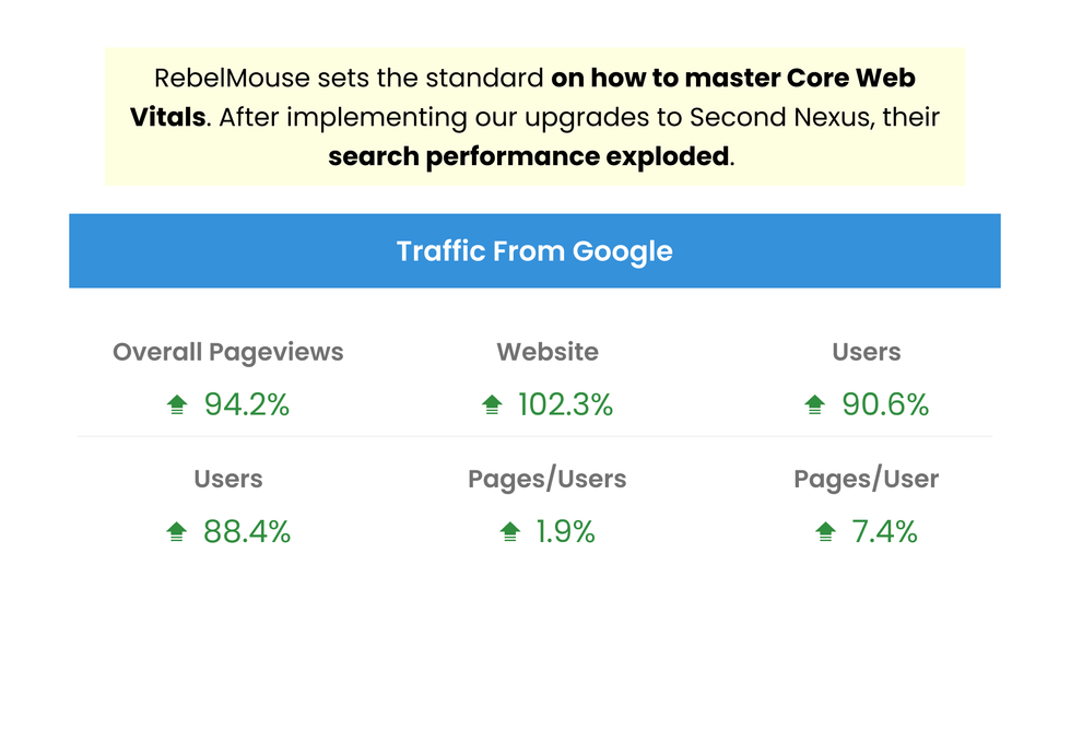 Site performance is the only way to win at search. Our Core Web Vitals optimizations helped Second Nexus experience a huge boost in search traffic.