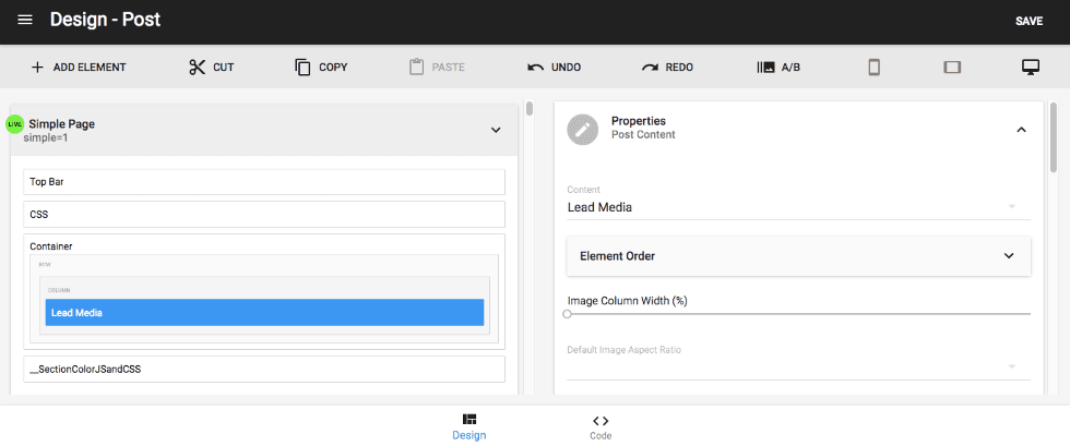 For the first method, start by locating the Lead Media element of your Post Page layout in the Layout & Design tool. Then, open up the Element Order menu in the Properties card to the right: