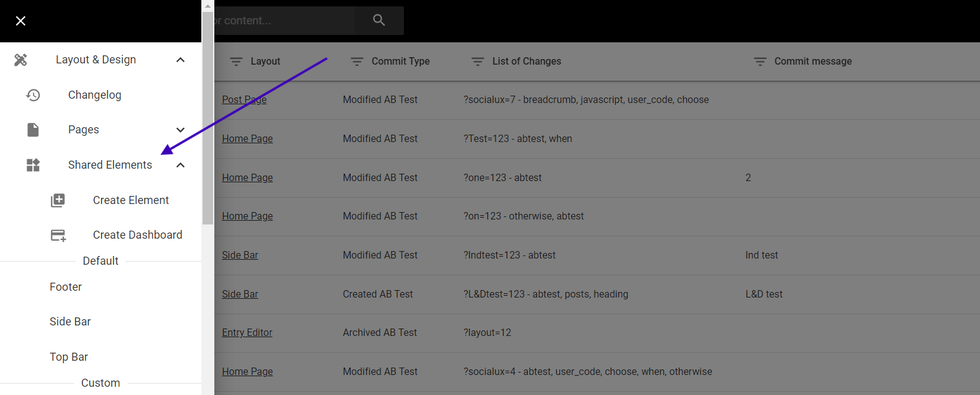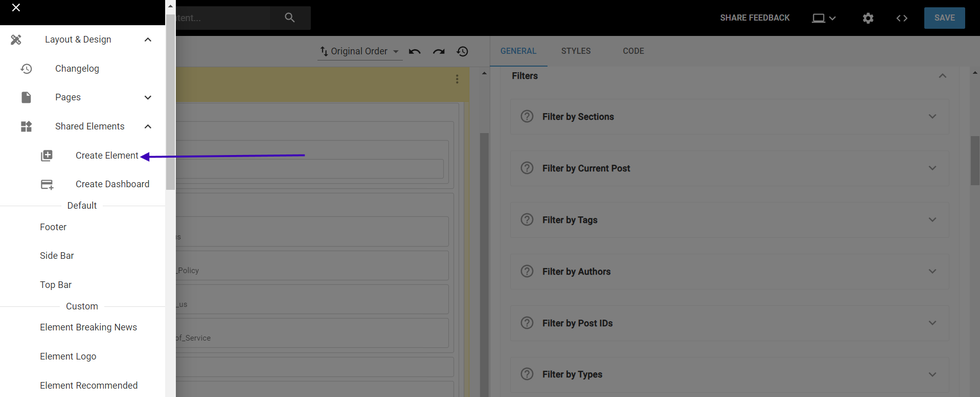 With Shared elements, you are allowed to create and use the same element on different pages or even different layouts. This guide will cover the Default & Custom Elements and How to create, edit, and add them in different layouts. On L&D go to the left panel and select “Shared Elements”.