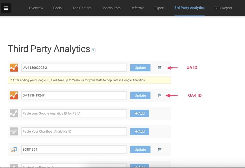 - UA and GA4 IDs (already found in RebelMouse’s Third-Party Analytics dashboard, but it’s always good to double-check)