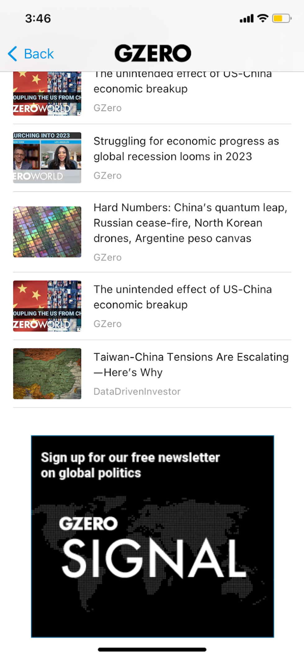 Example Ad: GZERO Media’s Signal newsletter advertised at the bottom, right after the ”Recommended” module.