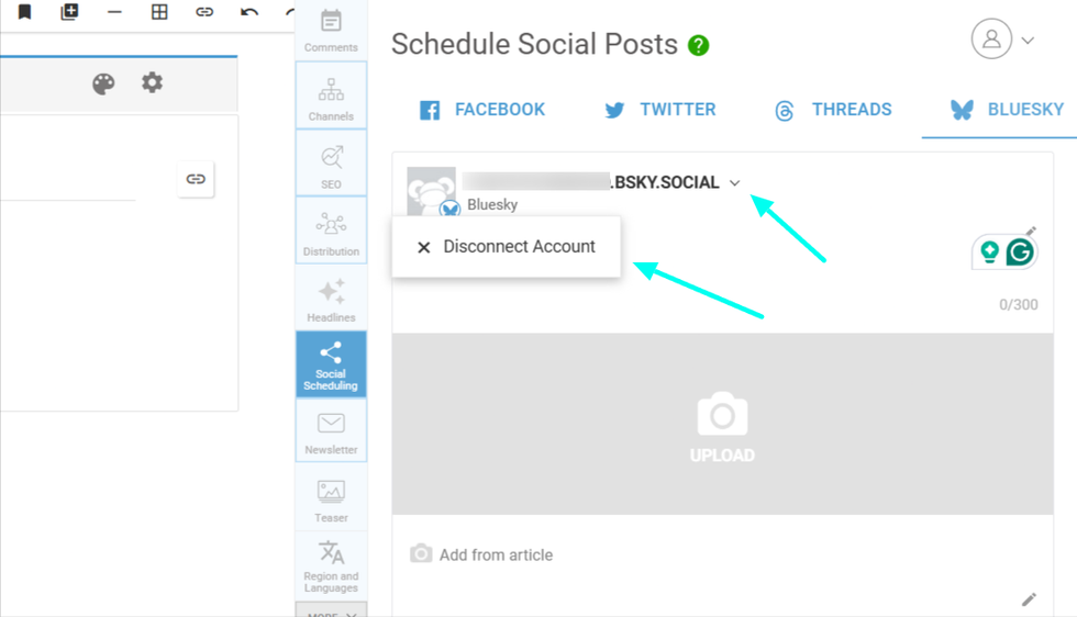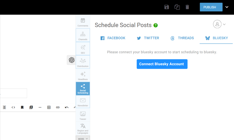 While on the Entry Editor and with the Social Scheduling tab opened, you will find a small menu with options to connect your Facebook, Twitter, Threads, and Bluesky accounts.