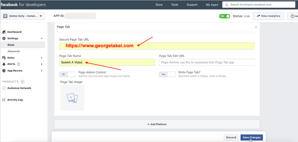 You'll want to insert your Facebook App ID and the URL you linked to when setting up your Facebook tab. Your Facebook App ID can be found in the top bar of Facebook's app dashboard: