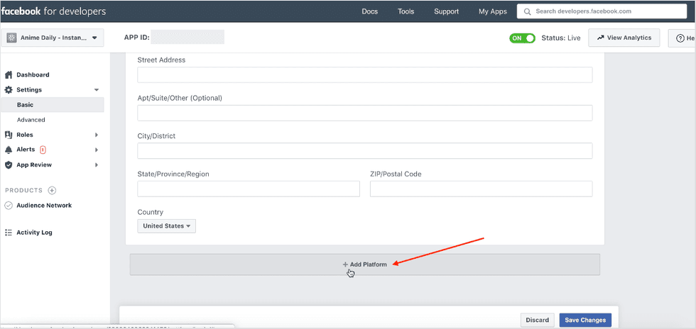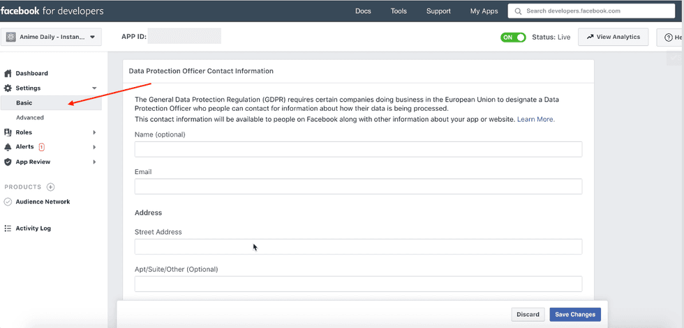 To get started, head over to your Facebook App. Then head to your app dashboard. From there, click on Settings and then Basic: