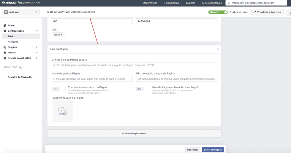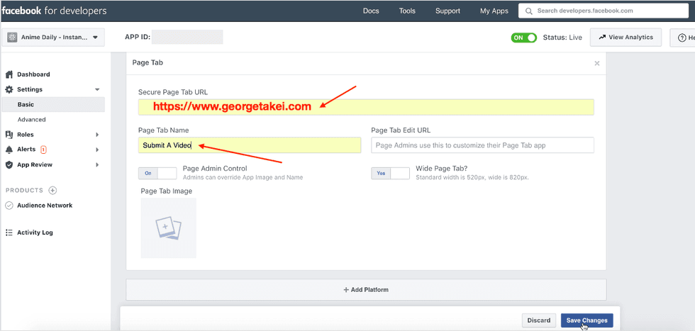 You'll want to insert your Facebook App ID and the URL you linked to when setting up your Facebook tab. Your Facebook App ID can be found in the top bar of Facebook's app dashboard: