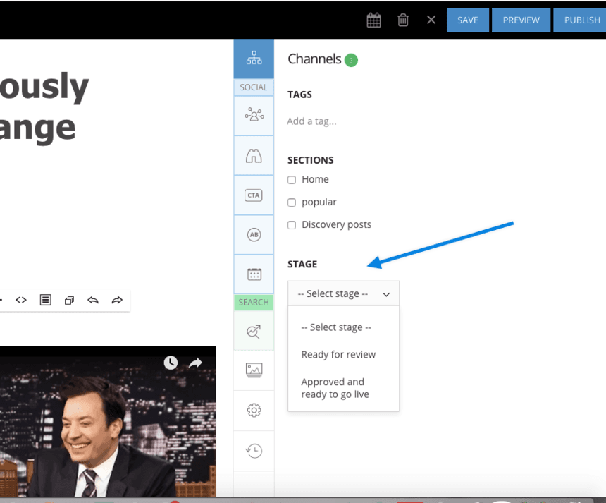 After a post draft is completed, utilize stages to notify your content peers that it's ready for the next step in the content creation process. To do this, save your article in an appropriate stage — such as For Review, Copyedited, or Ready to Publish — that appears in the Stage dropdown menu in the Channels tab: