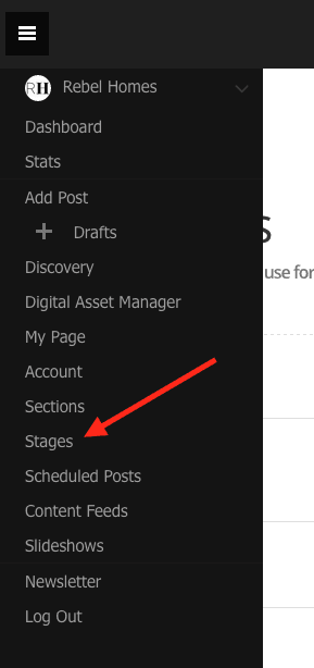 To access Stages, click Stages in the lefthand administration panel or simply type "YourDomain/core/dashboard/stages" in the URL bar: