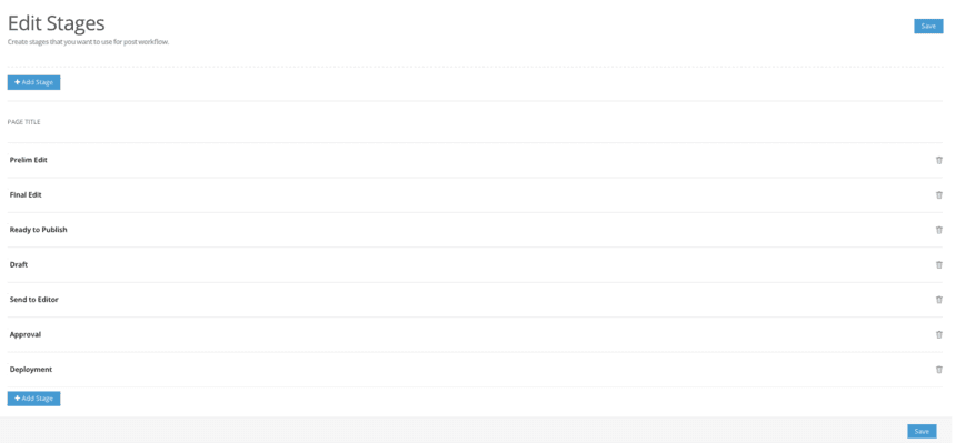 Once you open the Stages dashboard, you can begin to create as many stages as needed for each type of post: