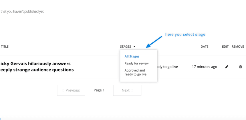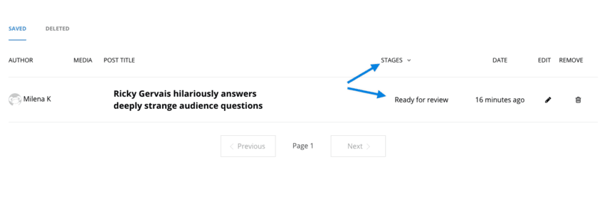 After you select the appropriate stage, make sure to save your changes. Your post will then be assigned to the stage that you've selected. When your editors are ready to review all of the staged drafts, they can go into the Drafts dashboard and select the respective stage that you assigned in the previous step to filter all posts. In this example, we've named the stage "Ready for review."