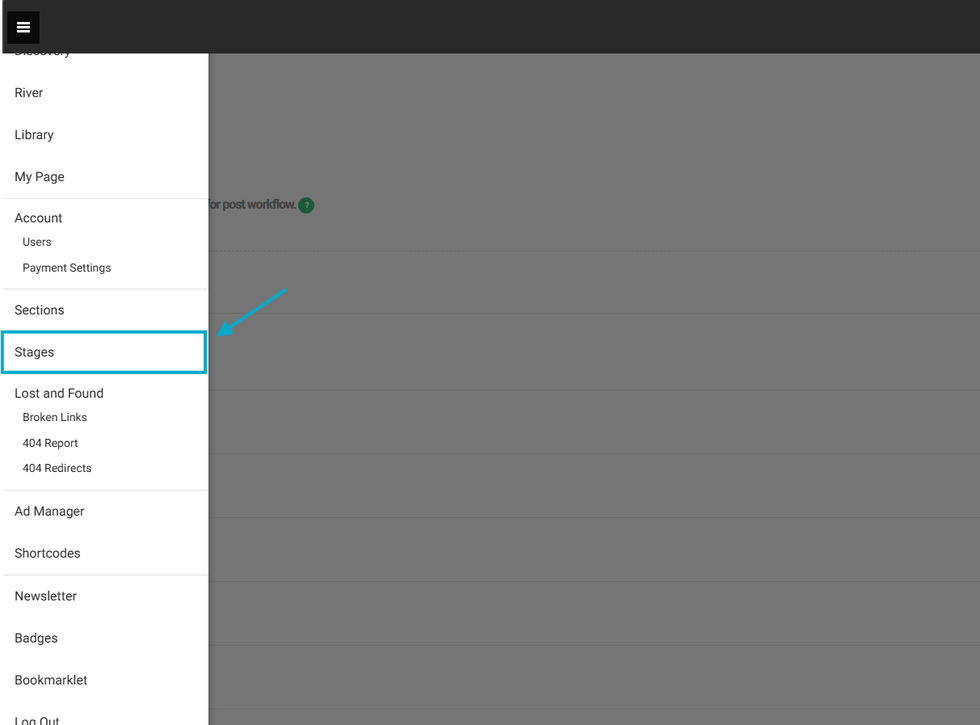 Simply append /core/dashboard/stages to your site's main URL for quick access. Alternatively, you can access the Stages Dashboard by clicking the hamburger menu (☰) in the top-left corner of your Posts Dashboard, scrolling down, and selecting Stages.