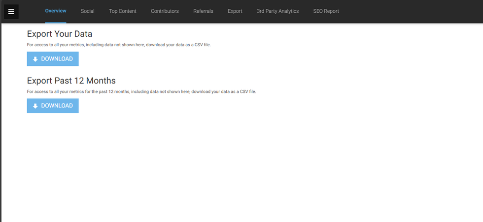 This tab allows you to export all your site data in a CSV File. The file is divided into 2 main data sources: Overall Content Hub Performance and Content Performance.