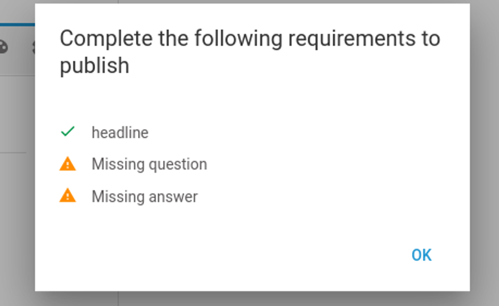 In case you don’t add either a question or an answer to a particle, we will remind you to do so through our validation check: