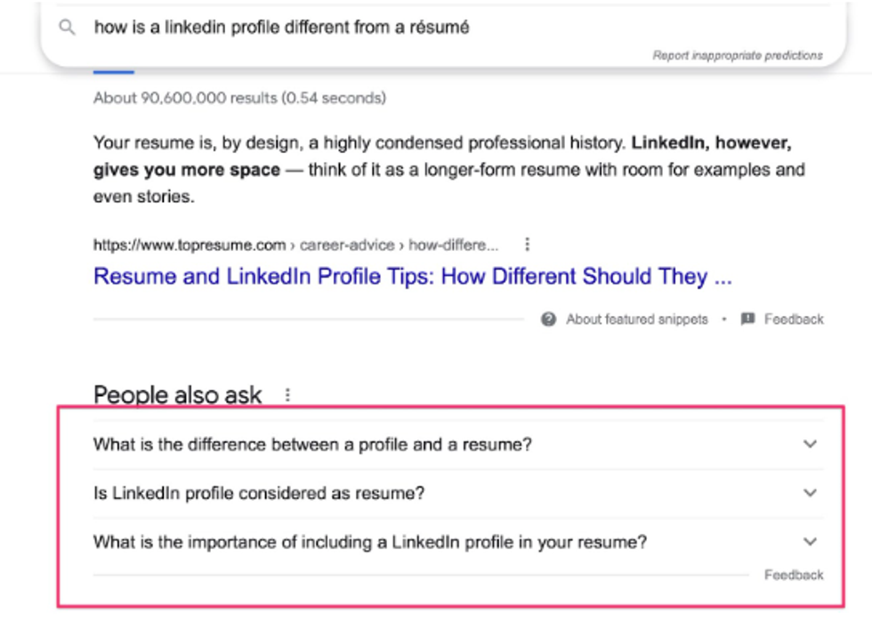 The module appears on the search engine results page. It surfaces other questions relevant to the user’s search queries. There’s no need to use the same exact wording, but these results can help you to identify other relevant questions that pertain to your search phrase.