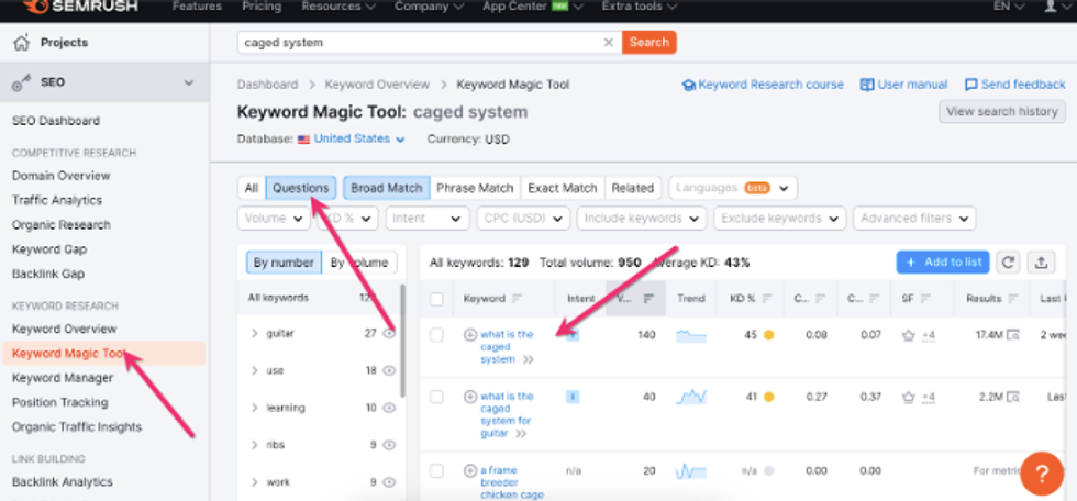 SEMRush has an Organic Research feature that lets you filter search phrases or keywords that appear as an FAQ on the search results page. The Search Features (SF) column also indicates keywords that ranked through “People also ask,” Featured Snippet, and other SERP position.