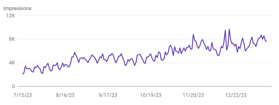 In one instance, we started with a 59% Site Health Score, made continuous improvements over several months, and ultimately boosted the score to 92%. Search impressions increased along the way, more than doubling from where they started: