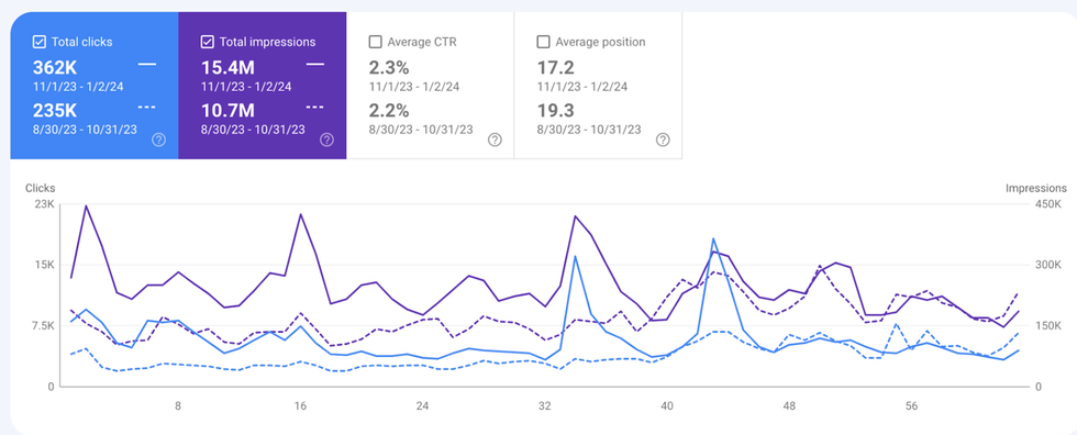 With another client, since beginning Semrush audits and fixes, we observed a 54% increase in clicks and a 44% increase in impressions vs. the two months before the audits.