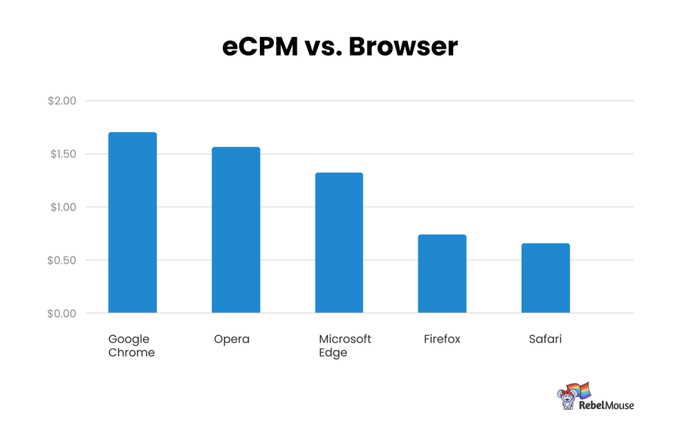Recently, our team of growth strategists researched browser analytics to uncover just how big this impact will be on advertisers. One of the more striking findings from our analysis was the disparity in ad performance between different browsers. For example, Safari has already disabled third-party cookies and captures approximately 30% of U.S. web traffic. Despite its substantial user base, the average effective cost per 1,000 ad impressions (eCPM) is $0.62. By contrast, Chrome, with its larger share of U.S. web traffic at approximately 38%, has a substantially higher average eCPM at $1.67.