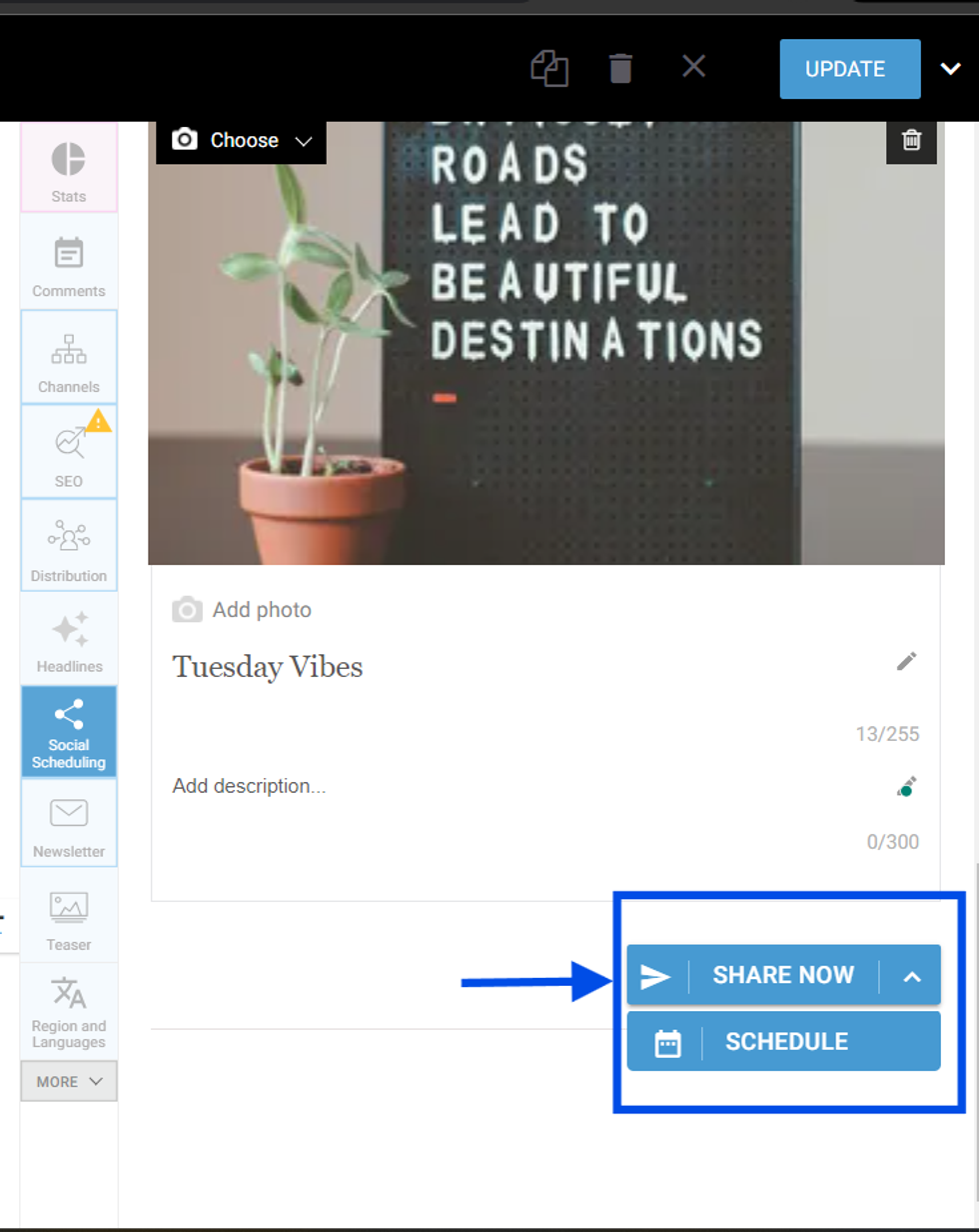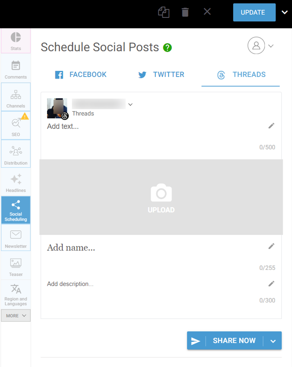 Sharing to Threads works similarly to Facebook and Twitter. Simply add the headline, description, and image, and then post it to Threads. You can choose to Share Now to post immediately to Threads, or Schedule it for a specific date and time instead.