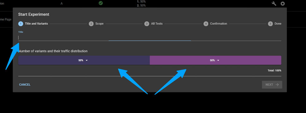 Give your test a Name and choose how many different variants you want to test. To each variant, you will decide what percentage of traffic will be assigned to it (e.g., variant 1 gets 40% and variant 2 gets 60%). You can choose up to 4 different variants to test in the same experiment, but the total amount (sum) of all the percentages needs to be 100%.