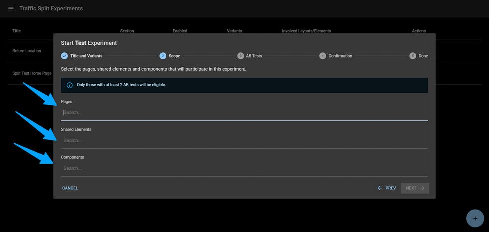 For each selected page, shared element, or component participating in your test, you will assign which A/B test will be used for each variant (e.g., "variant 1 shows the blue button," "variant 2 shows the green button").