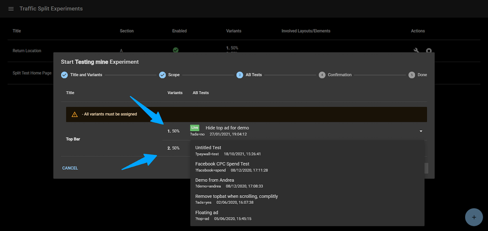 Still, as usual, you will be able to modify the AB tests within the page/element/component regardless of whether they are associated with a variant or not.Also, all AB tests participating in the experiment will be shown as live with a small badge that indicates the variant they belong to and the percentage associated to the variant: