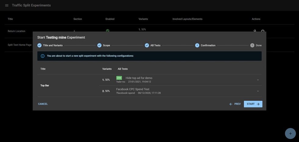 This new page is the command center for all your split tests. It will have a table showing every ongoing test with the following columns: