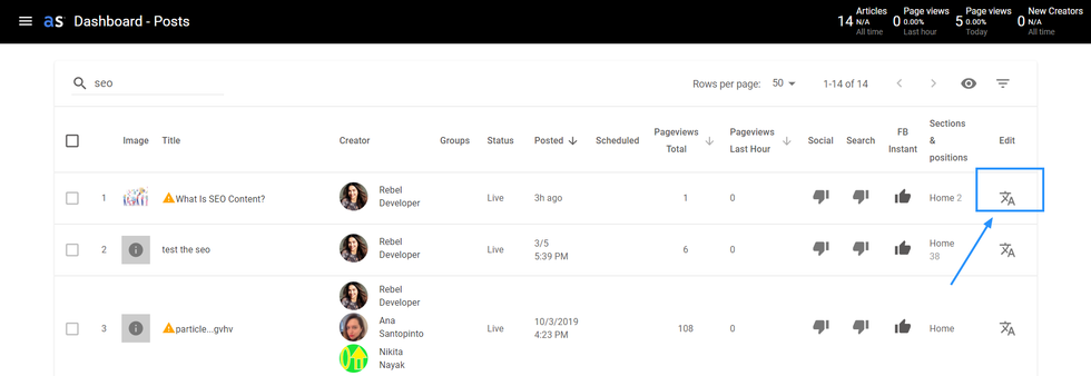 Once you've created your Translator user, you can easily translate articles from your Posts Dashboard. Click the Google Translate icon under the Edit column to translate a specific article: