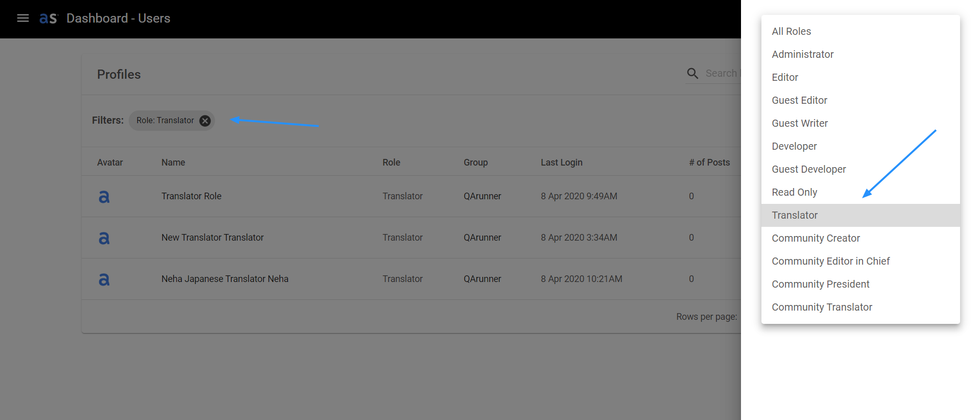 If you've already created Translator users, you can use the Filters function in your Users Dashboard to see them all at once: