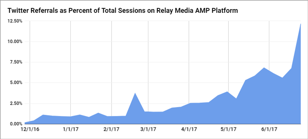 Relay Media, a strictly AMP-based platform, reports that since the switch to AMP, sessions have spiked from 4% in December 2016 to 20% in June 2017. They also found that since the shift to AMP, 10–15% of their AMP visits are not sourced from Google search, but rather from platforms like Twitter.