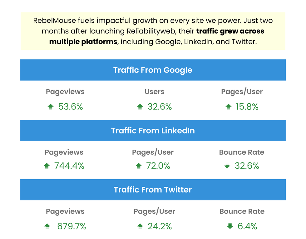 Content creation is no longer a linear process. RebelMouse is a holistic publishing platform that supports your content's success across platforms. Check out Reliabilityweb's increase in traffic across distribution platforms just two months after launch: