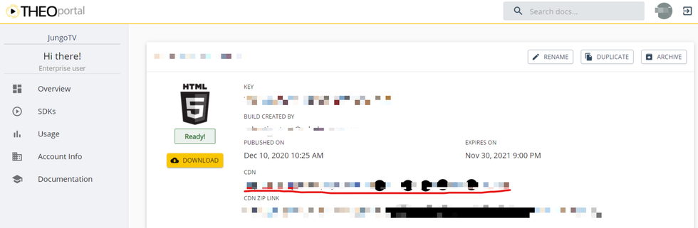 THEOplayer Library Location: To locate this, navigate to your THEOplayer Dashboard and locate the CDN Library Location of the SDK.