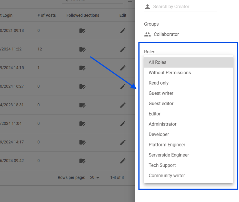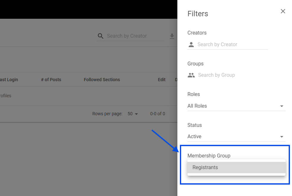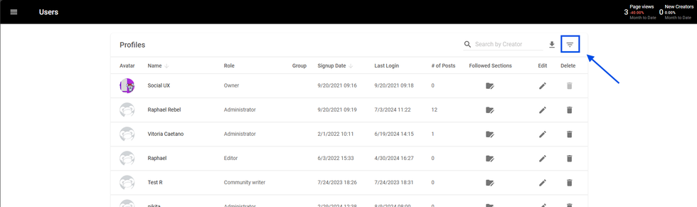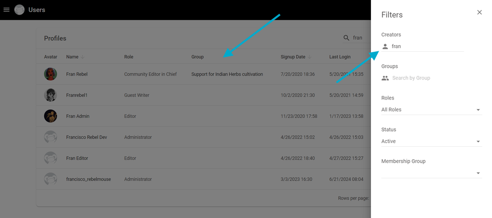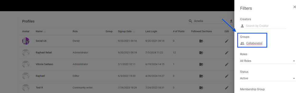 Similar to the filter by the creator, here you type the name of the group - or community - you want to search users from. Once you start typing, the list of users in the Users Dashboard will update with the results of existing users that match your search by groups.