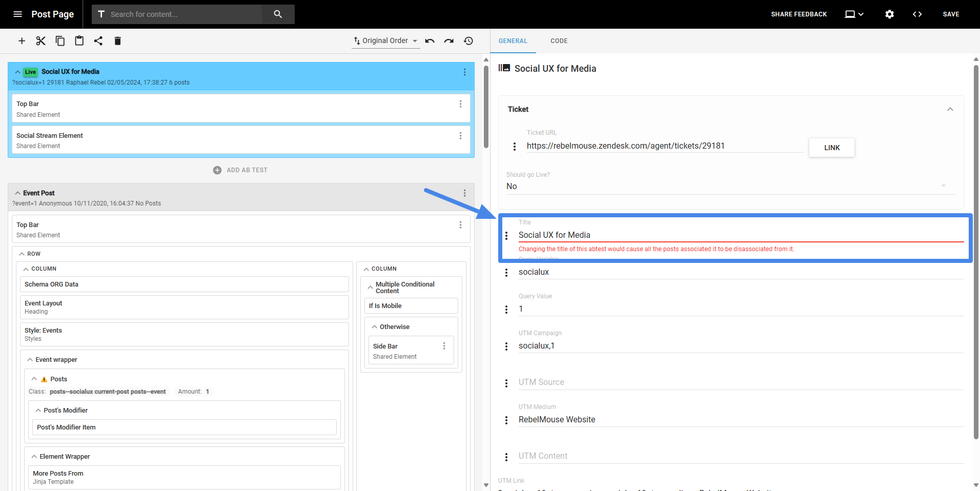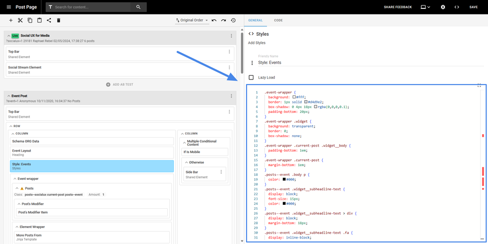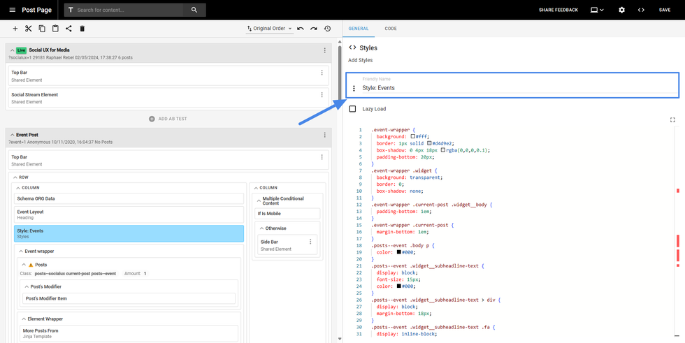 Note: the “code” field can change the name depending on the element. For example, if the element is a JavaScript element, the field will be named “<script>”, but it will still contain the pieces of code.