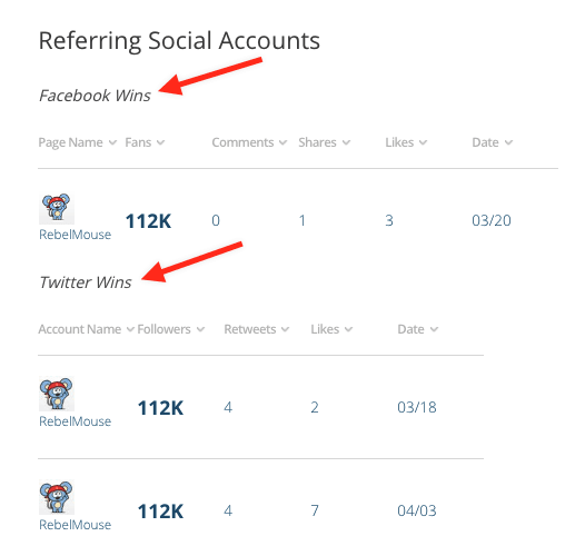 Referring social accounts from Facebook and Twitter (labeled as "Wins"):