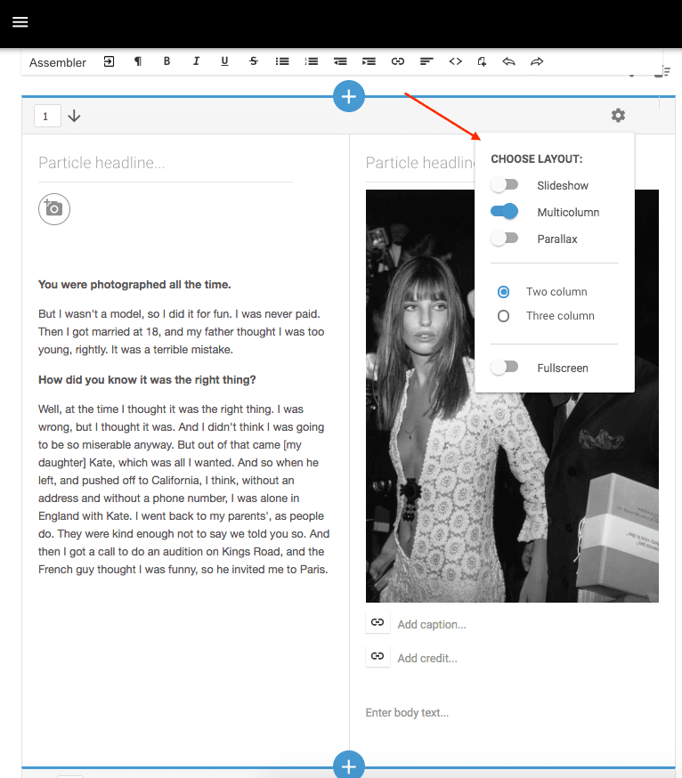 The Multicolumn Layout: Within each particle is the ability to build out columns to organize content and provide extra richness to longer posts. It's a simple toggle for a two or three-column layout.