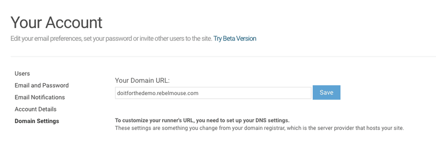 Once you've got your new DNS settings created, you can easily change your Domain Settings in your RebelMouse Account Dashboard.