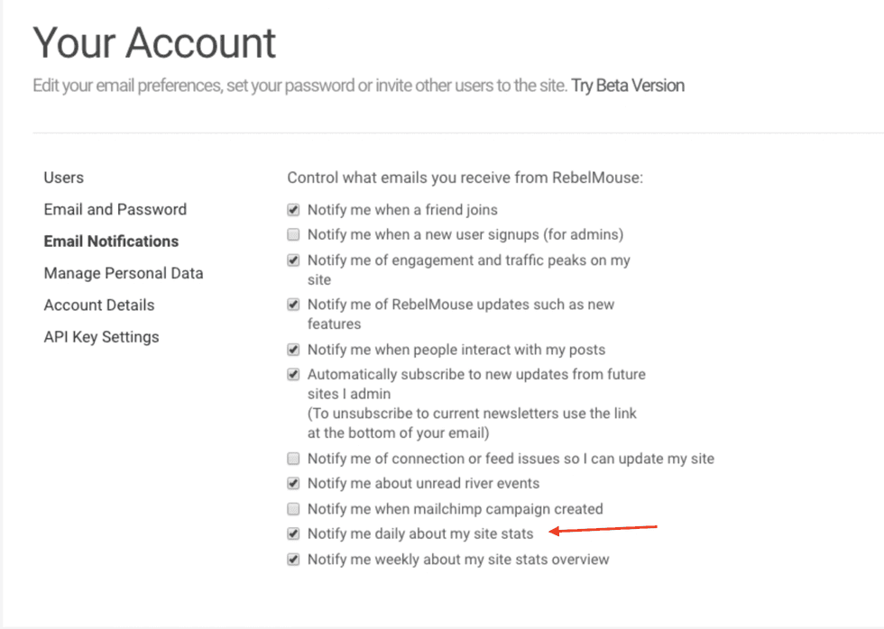 Note: In the screenshot above, the third checkbox is titled Notify me of engagement and traffic peaks on my site. This is a feature we offer called Velocity Alerts. Velocity Alerts will send out an email to you whenever an article is going viral. To us, the definition of "viral" is when an article receives more traffic than usual from another website or source, such as a social platform, in addition to increased site visits.
